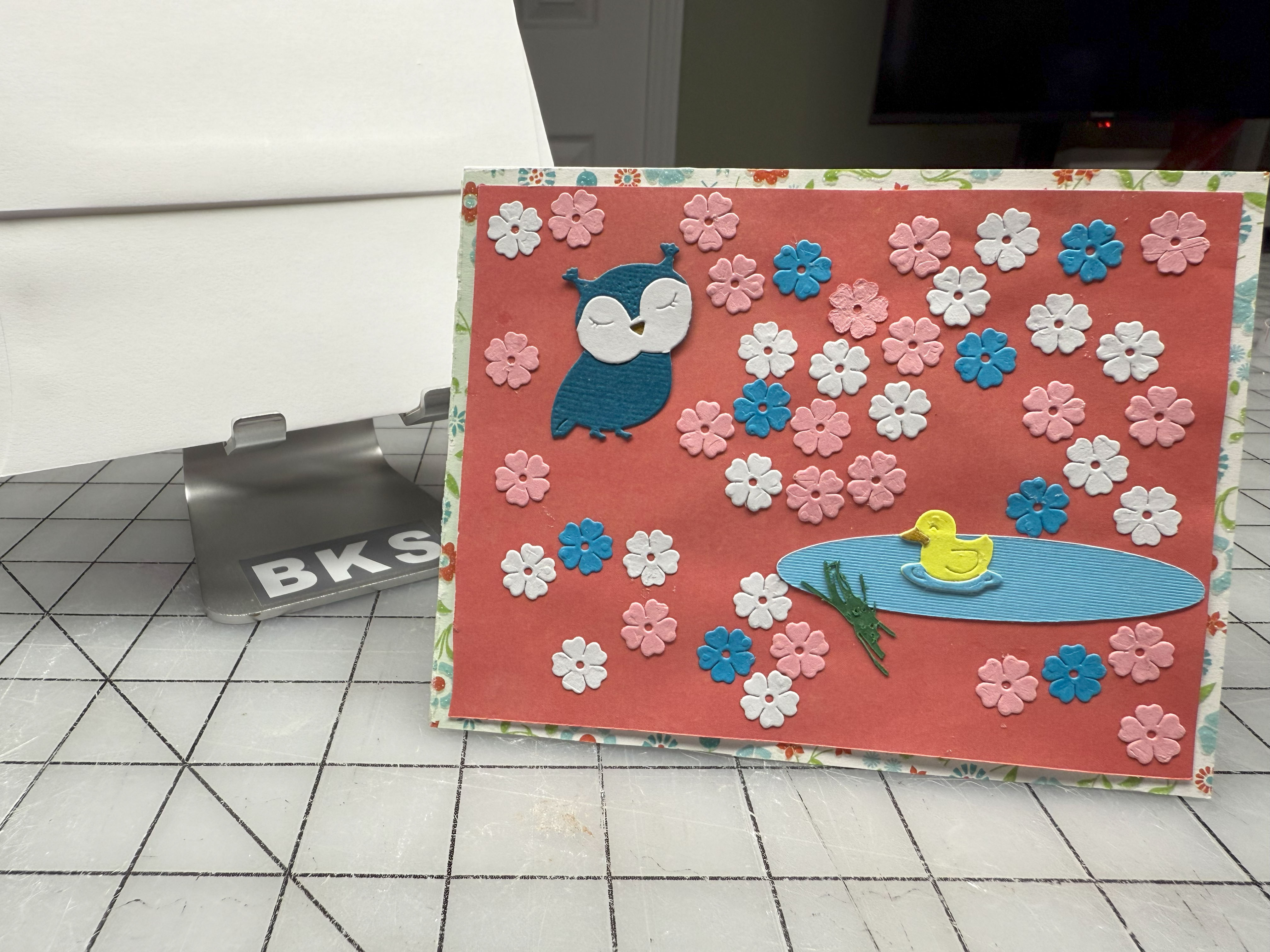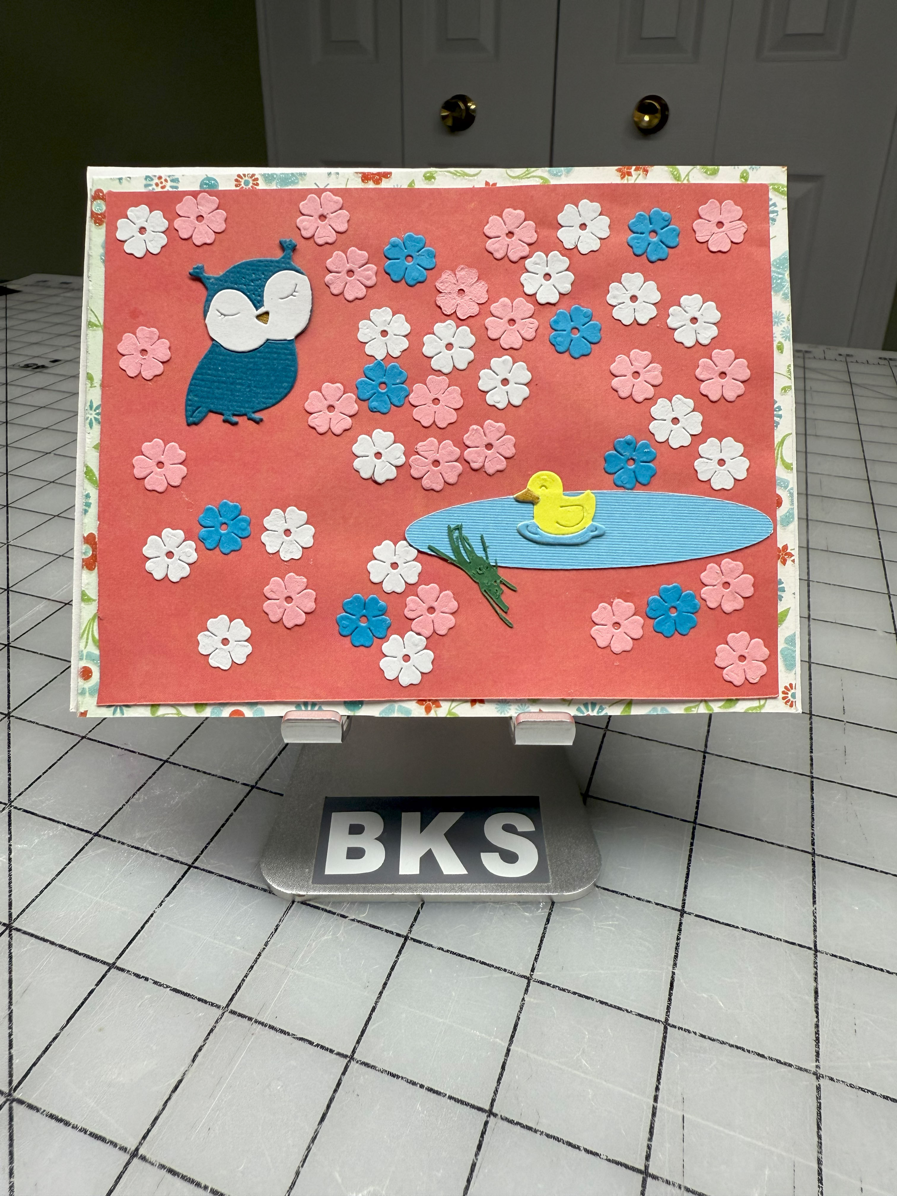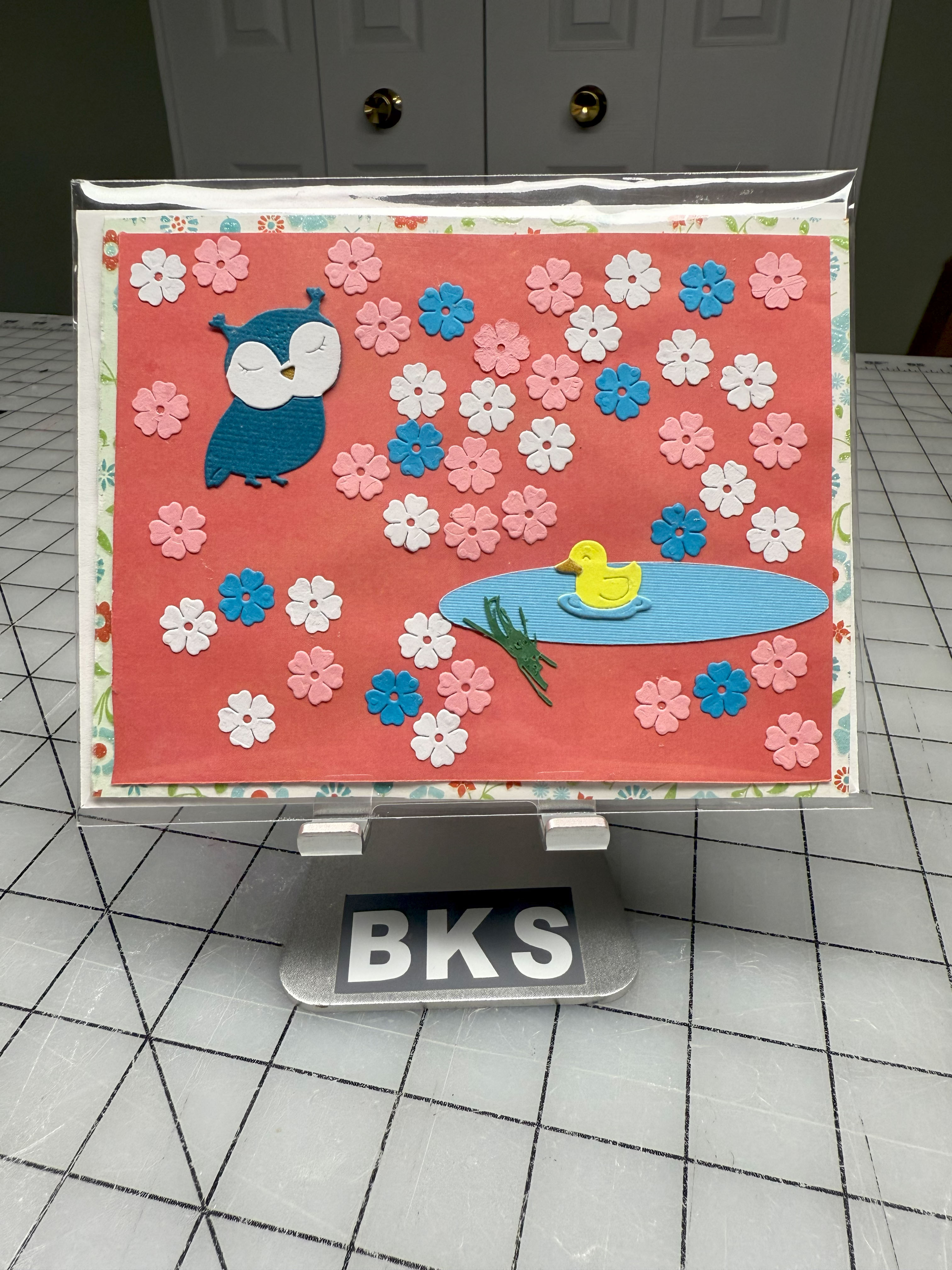 - Materials: Layered cardstock, die-cut owl, duck, flowers, and pond elements